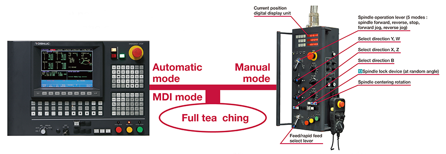 TOSNUC999(Triple nine) permits quick switching between manual, MDI and Automatic operation modes.