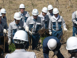新入社員や一般社員の植林作業は、「環境汚染を防止し、自然との調和を図ることにより、豊かで健康的な社会の環境づくりに参加する」という東芝機械グループの経営理念に基づき、環境保全活動の一環として平成9年度から実施しており、今年で9回目となりました。