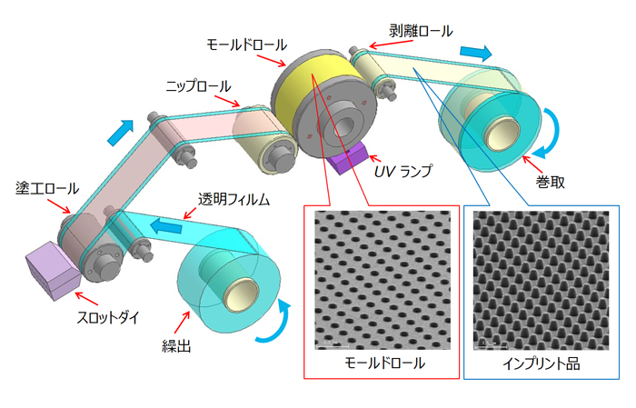 モールドロールの形状を転写します。 - 紫外線照射により樹脂を硬化させ、離型、巻取まで連続プロセスで行ない成形品を作成します。